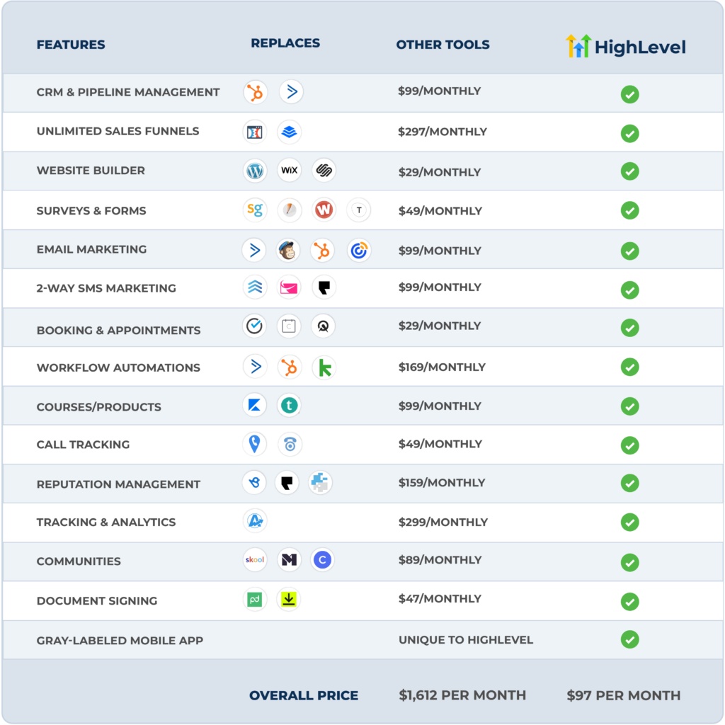 What it is: The full GoHighLevel suite: CRM, email & SMS marketing, funnel builder, calendar booking, workflow automation, website builder, and more.