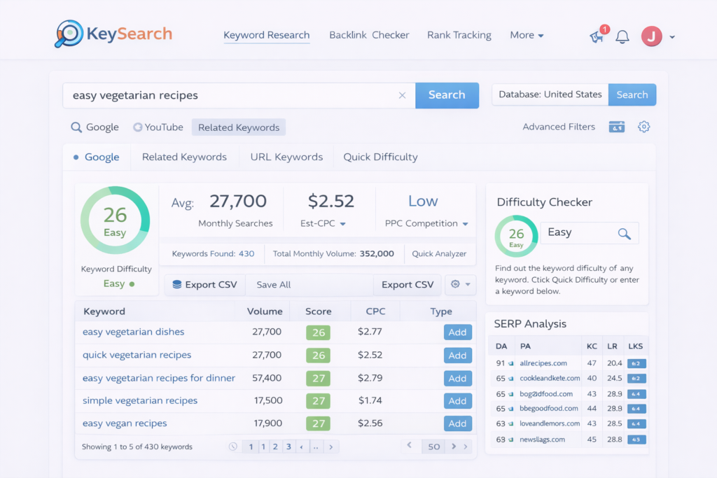 Think of it as your SEO Swiss Army knife. Instead of juggling five different subscriptions (one for keyword research, another for backlink analysis, another for rank tracking), KeySearch bundles the essential tools into one clean, intuitive interface.