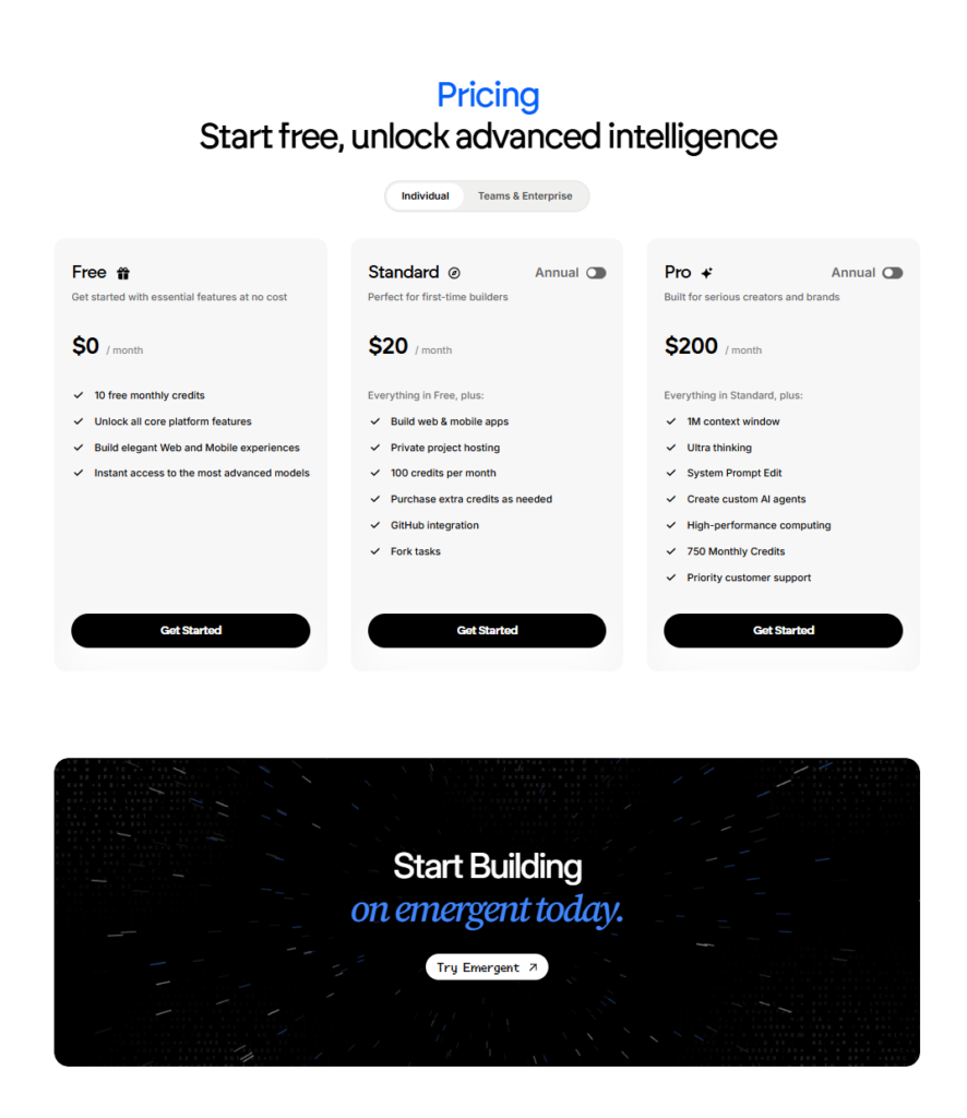 Head over to Emergent AI’s platform and click the “Get Started” or “Sign Up” button. You’ll see the available plans—choose the one that fits your needs (Pro is most popular).