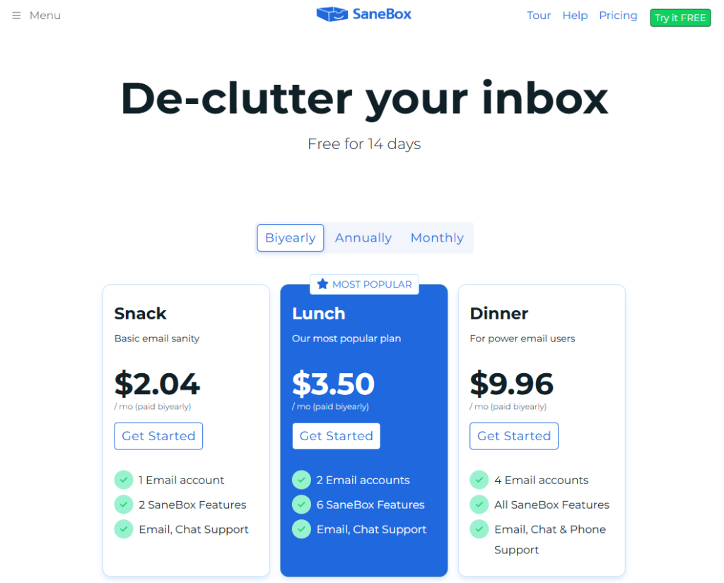 SaneBox offers three main pricing tiers designed for different email volumes and needs. All plans come with a 14-day free trial—no credit card required upfront.